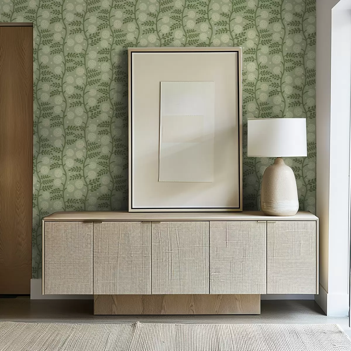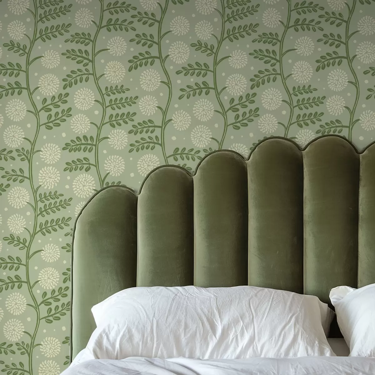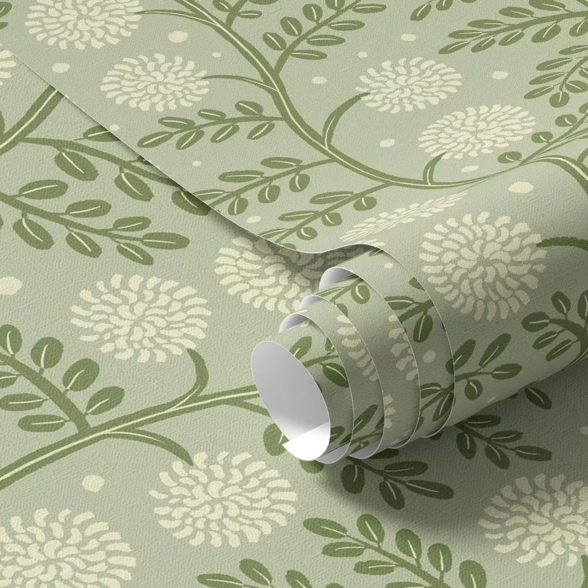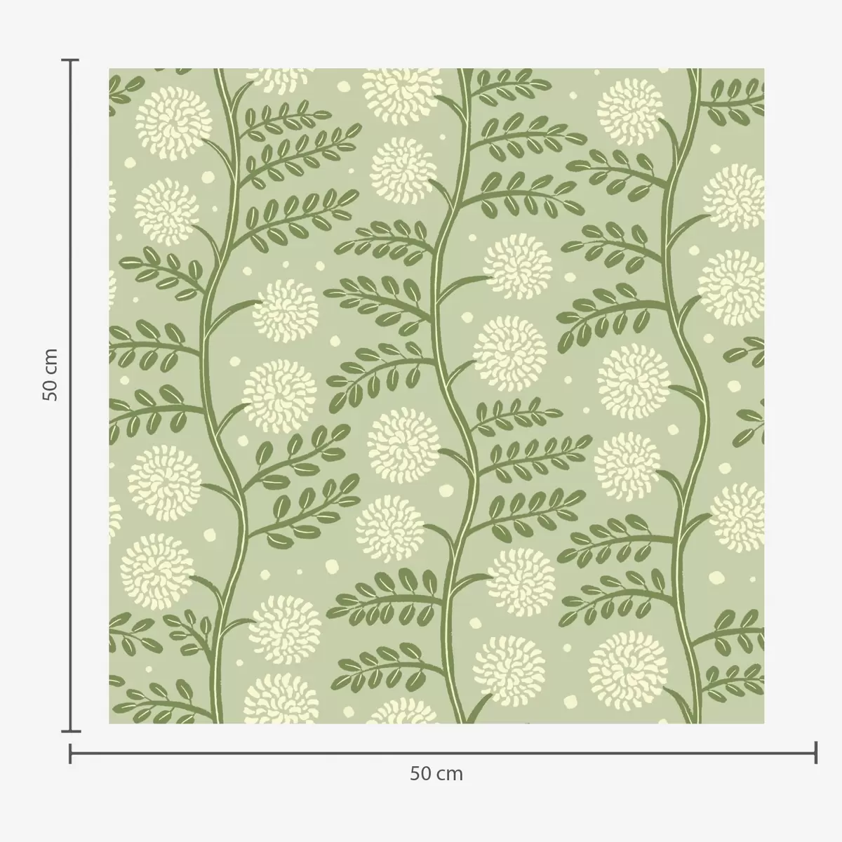 Papel pintado Tallos verde salvia con flores esponjosas de color marfil y lunares Nr. a00997v2