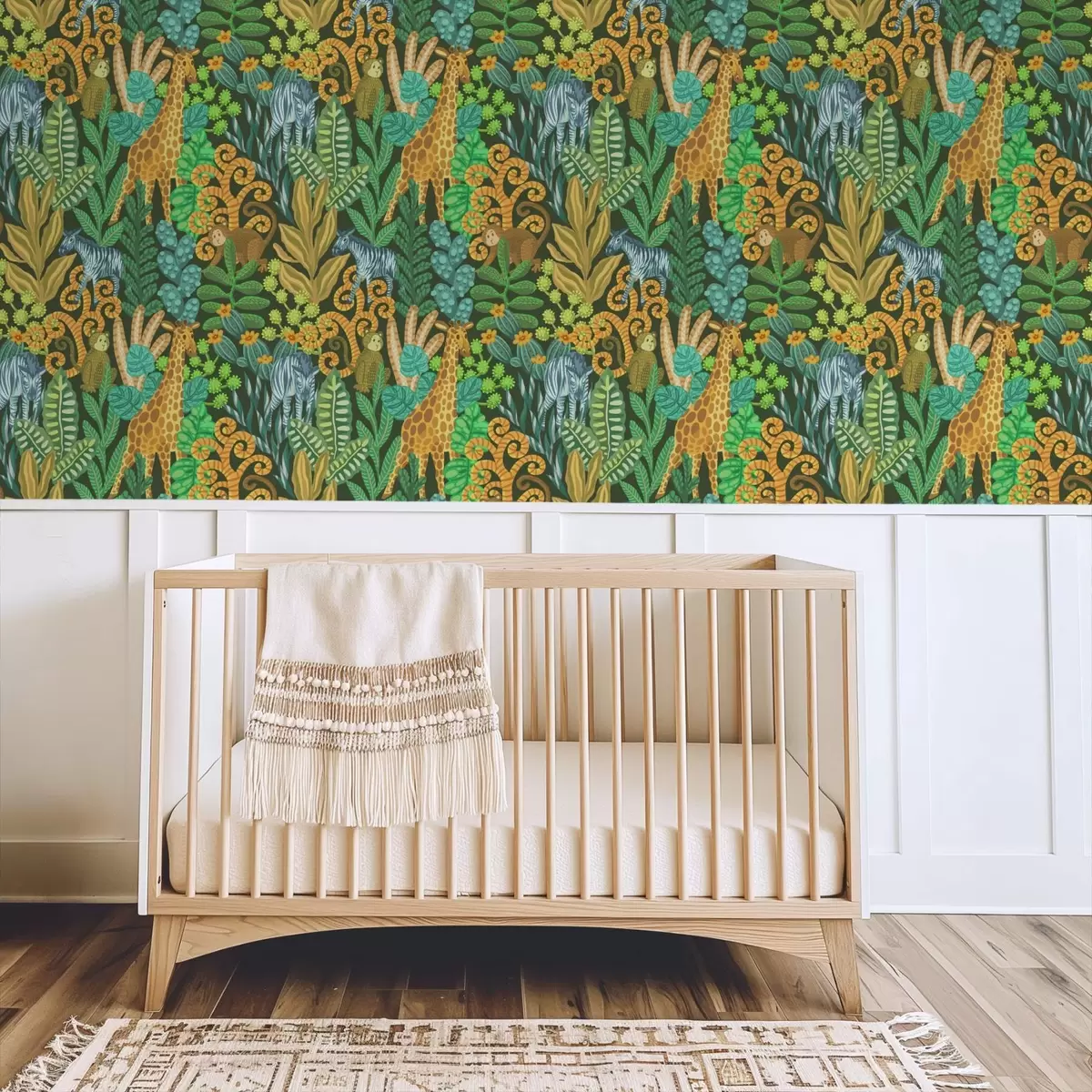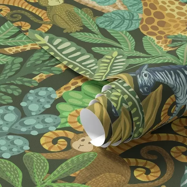 Papel pintado Selva densa con animales sobre un fondo verde oscuro. Nr. a01000v2