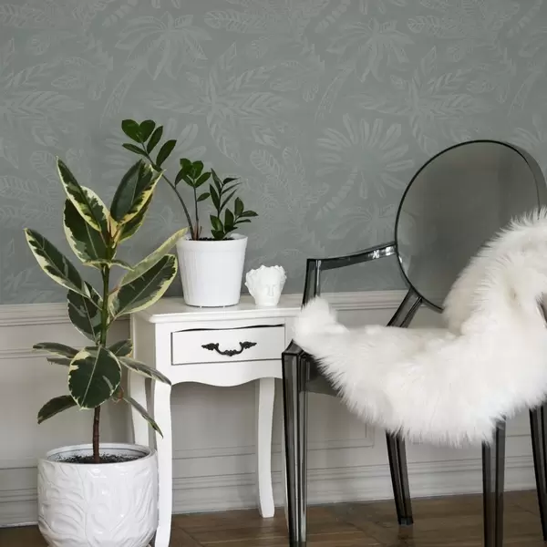 Papel pintado Hojas tropicales grandes y mates en una paleta de colores gris menta Nr. a01001