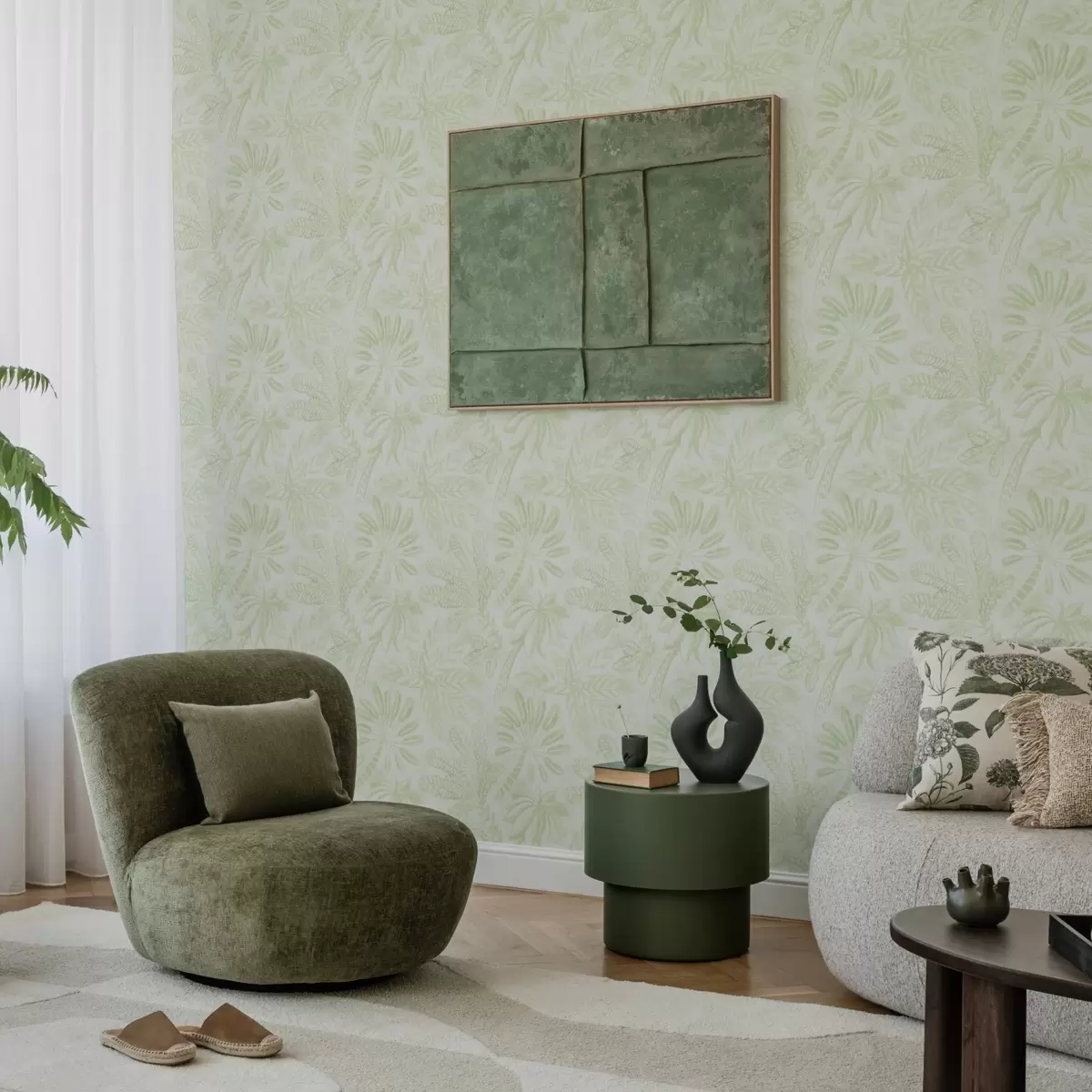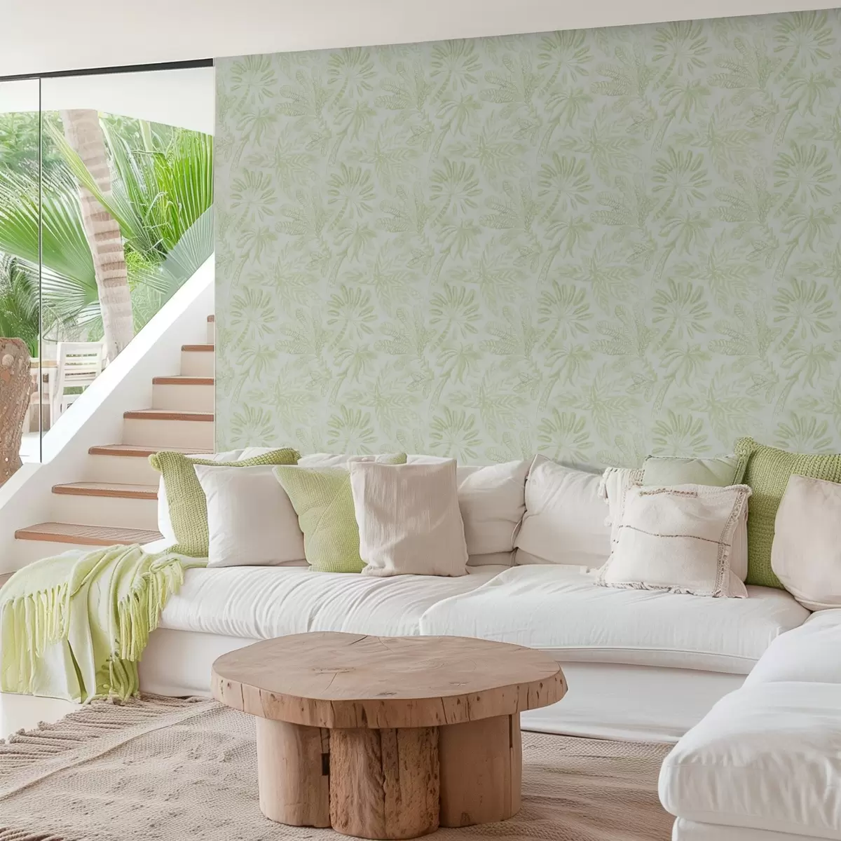 Papel pintado Hojas tropicales esbozadas en tonos verde claro frescos Nr. a01001v1