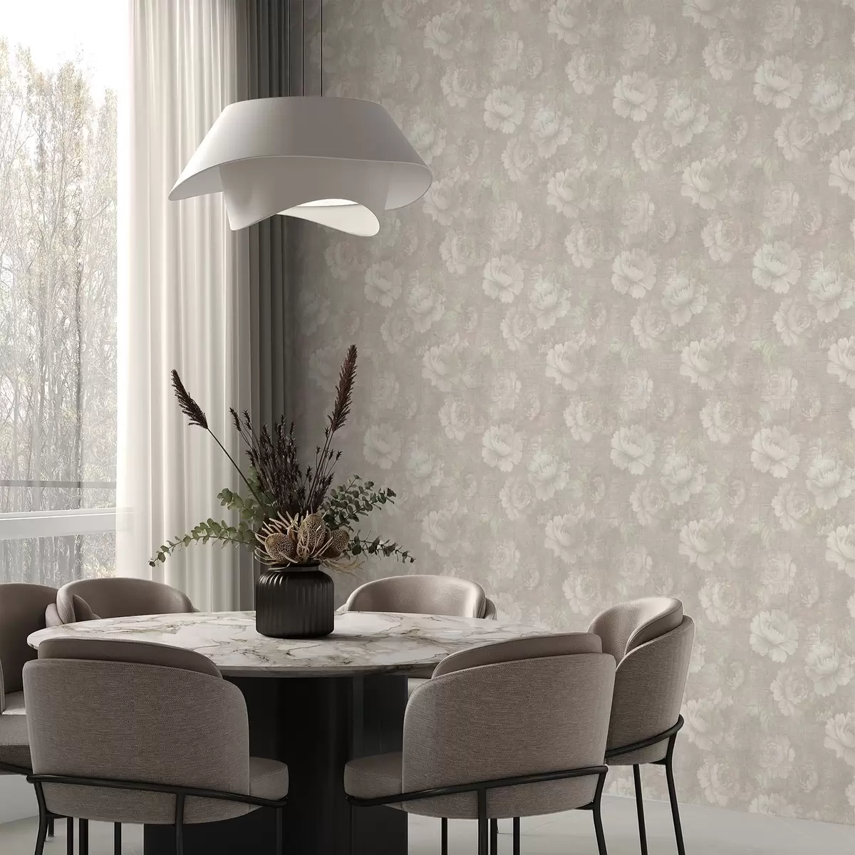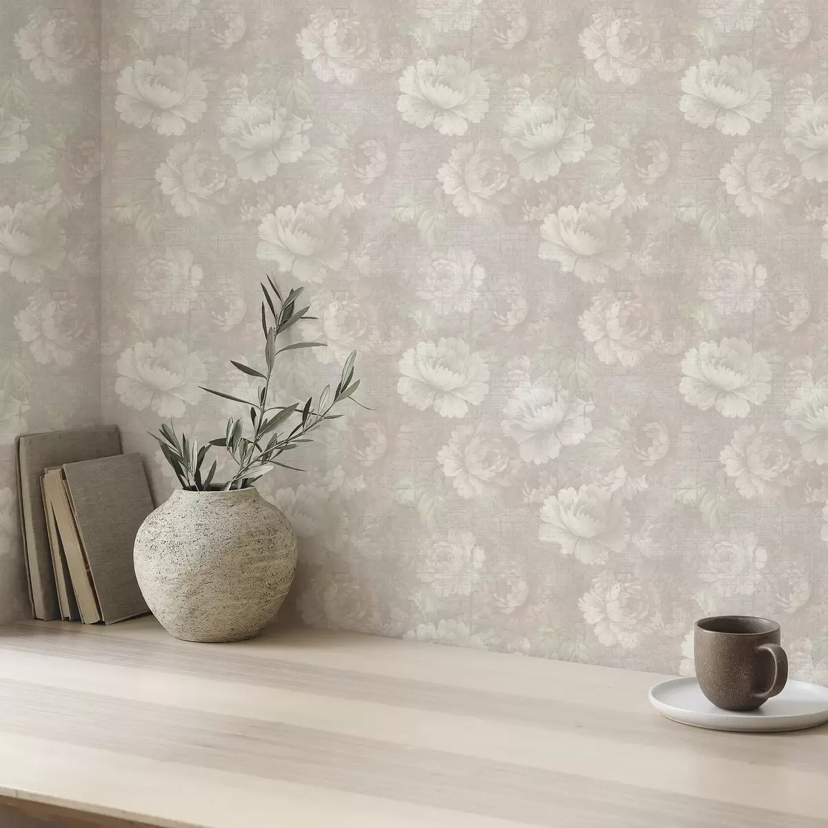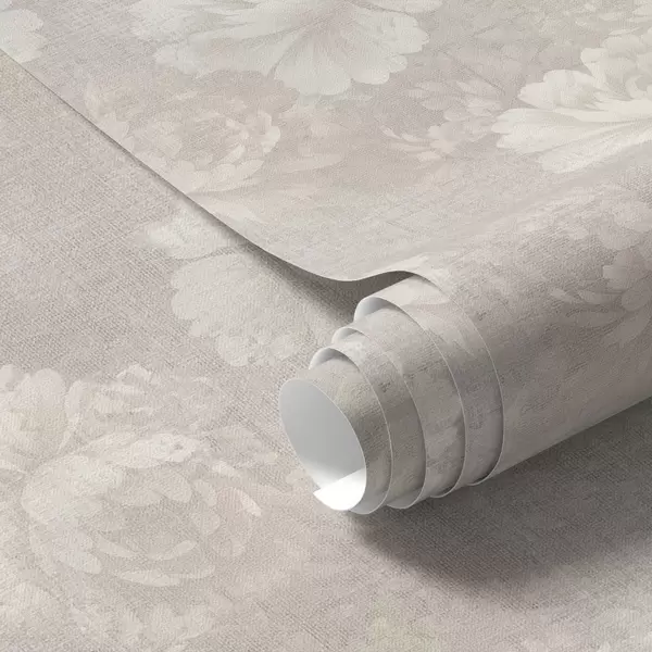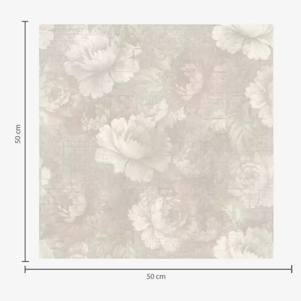 Papel pintado Peonías descoloridas sobre textura de lino en una suave paleta de colores beige. Nr. a01018