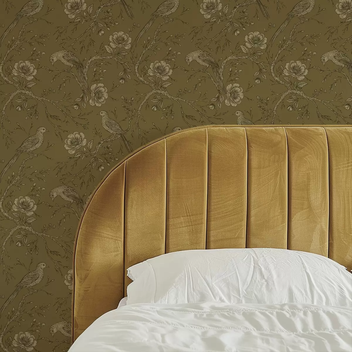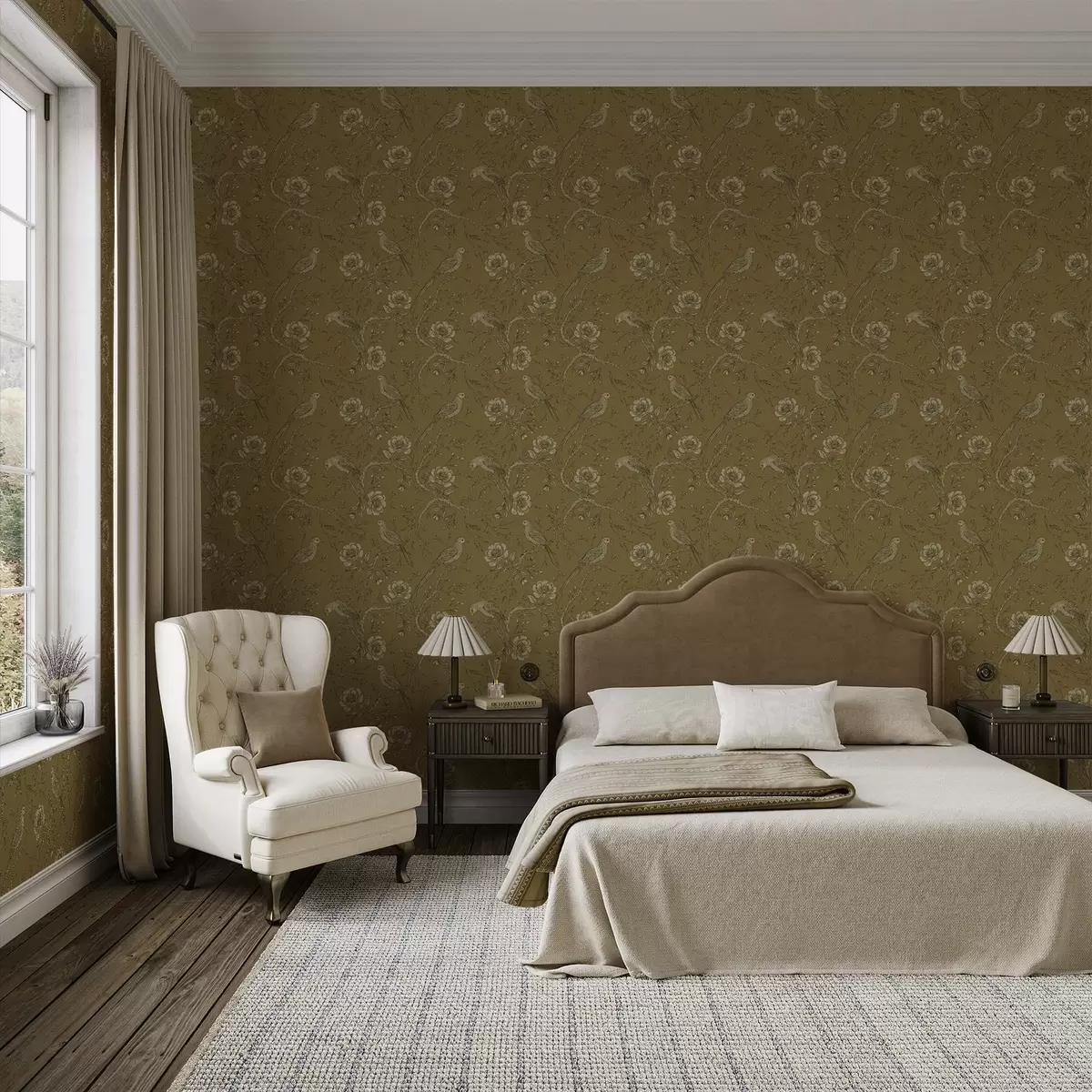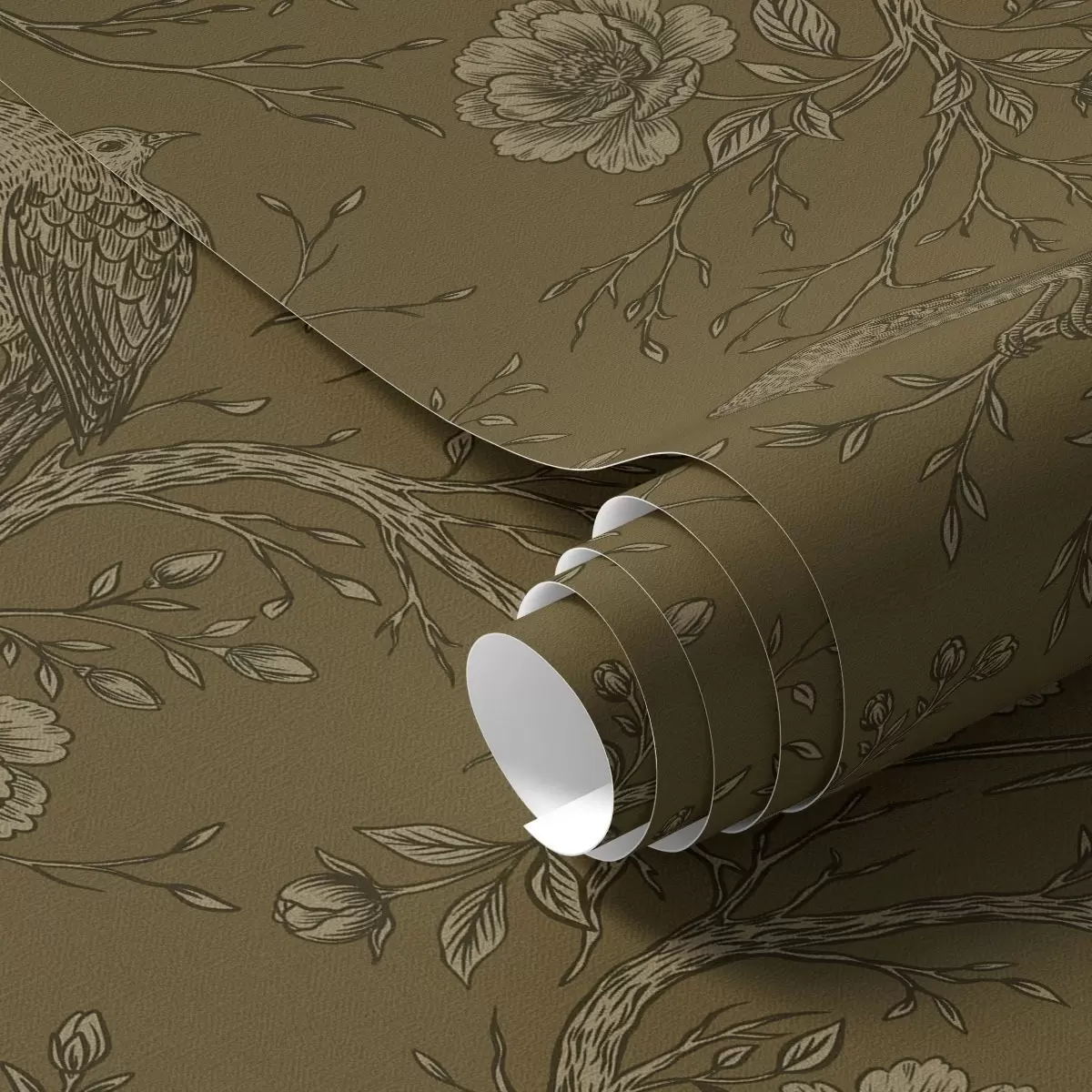 Papel pintado Aves y flores vintage sobre un cálido fondo oliva. Nr. a01022v1