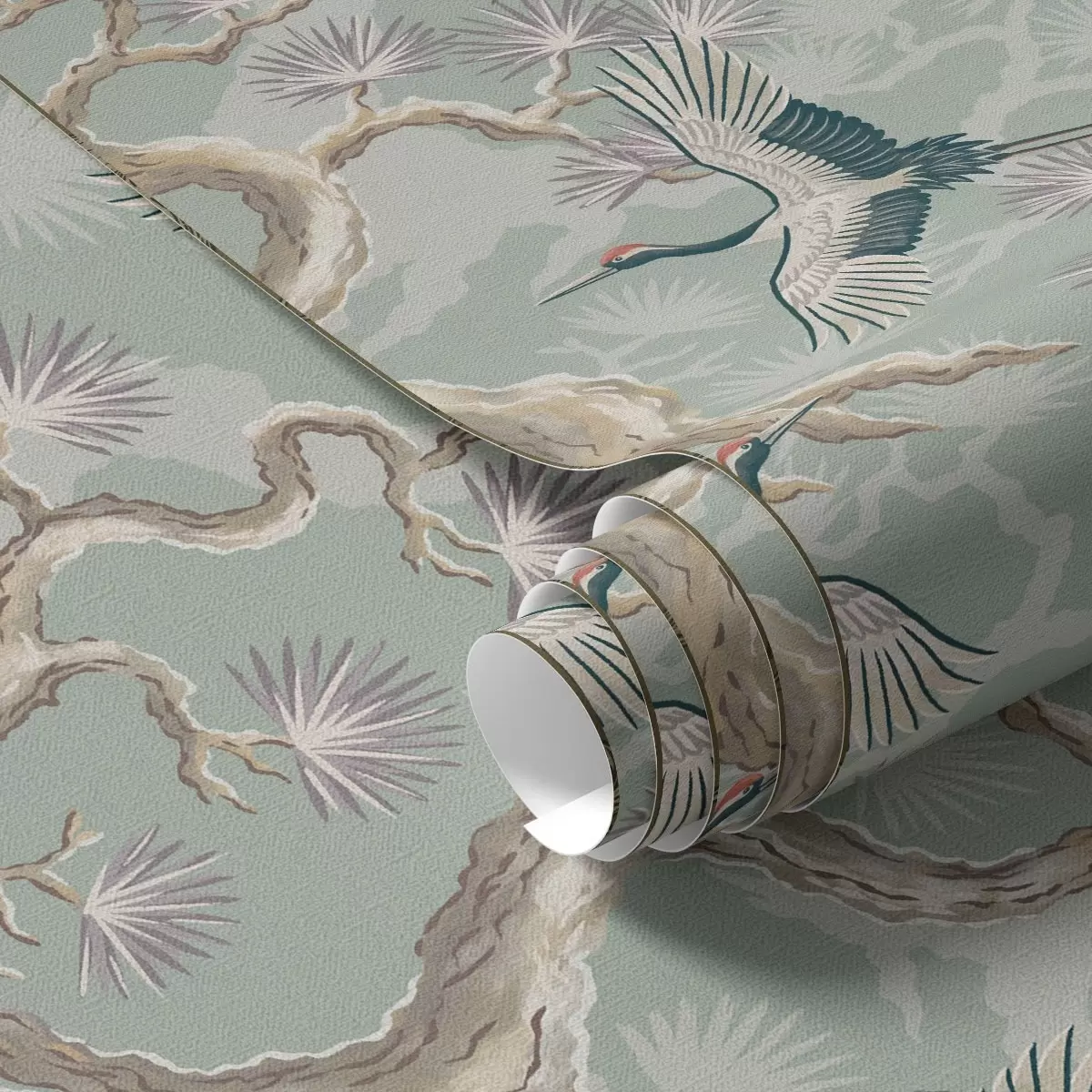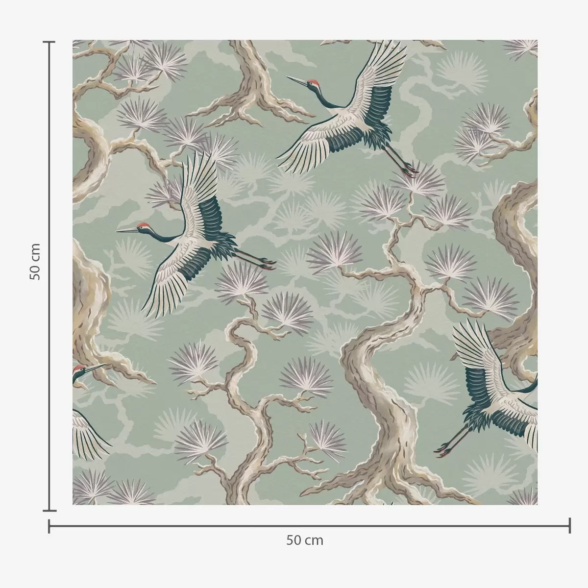 Papel pintado Grullas entre ramas curvadas sobre un suave fondo color salvia. Nr. a01023