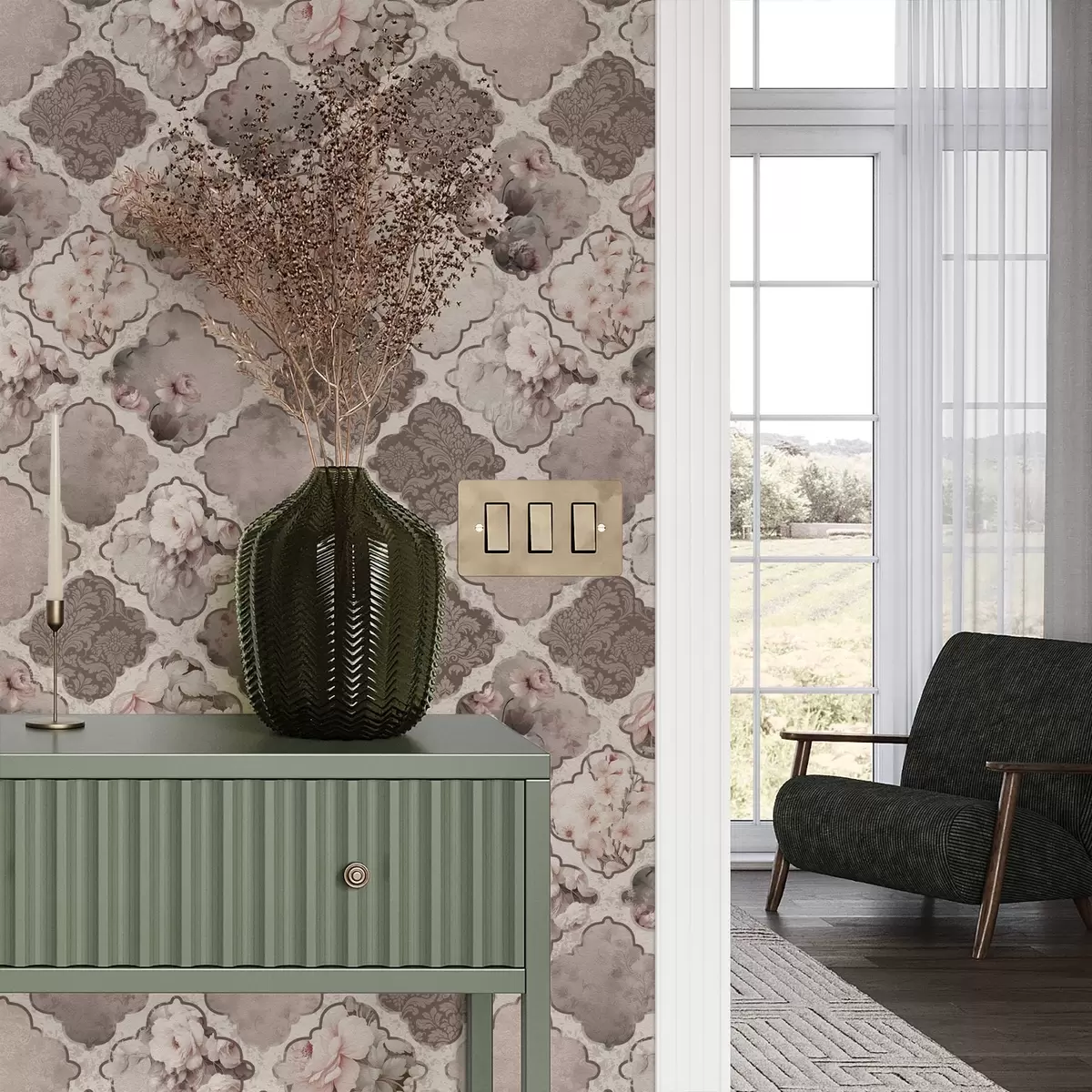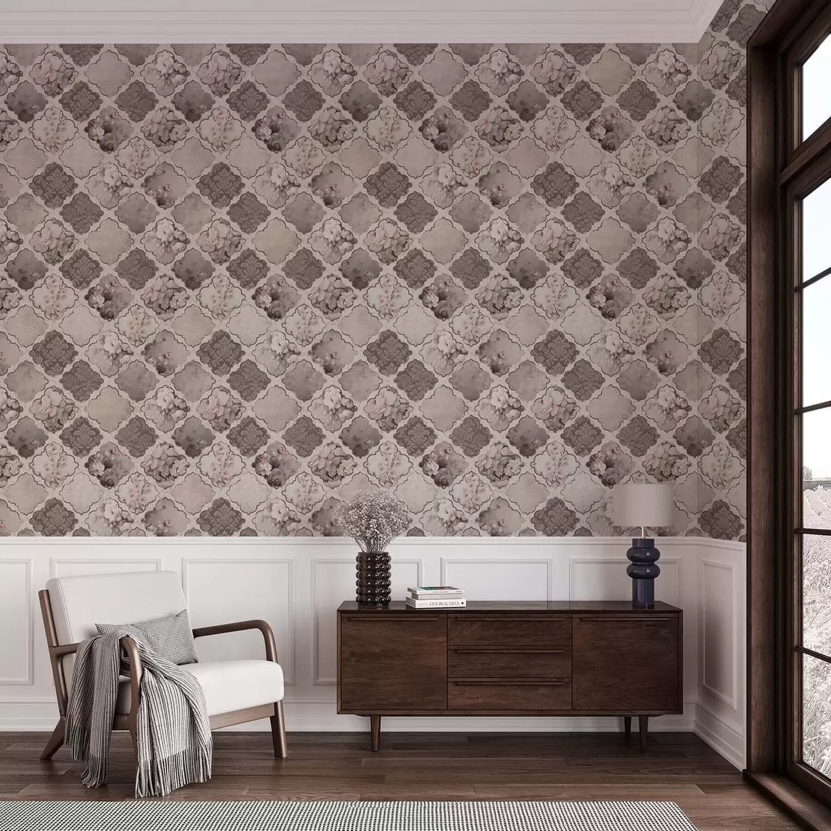 Papel pintado Romántico mosaico de medallones florales en tonos apagados. Nr. a01027