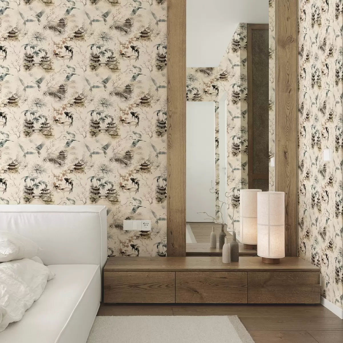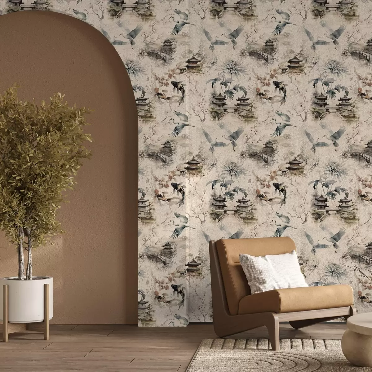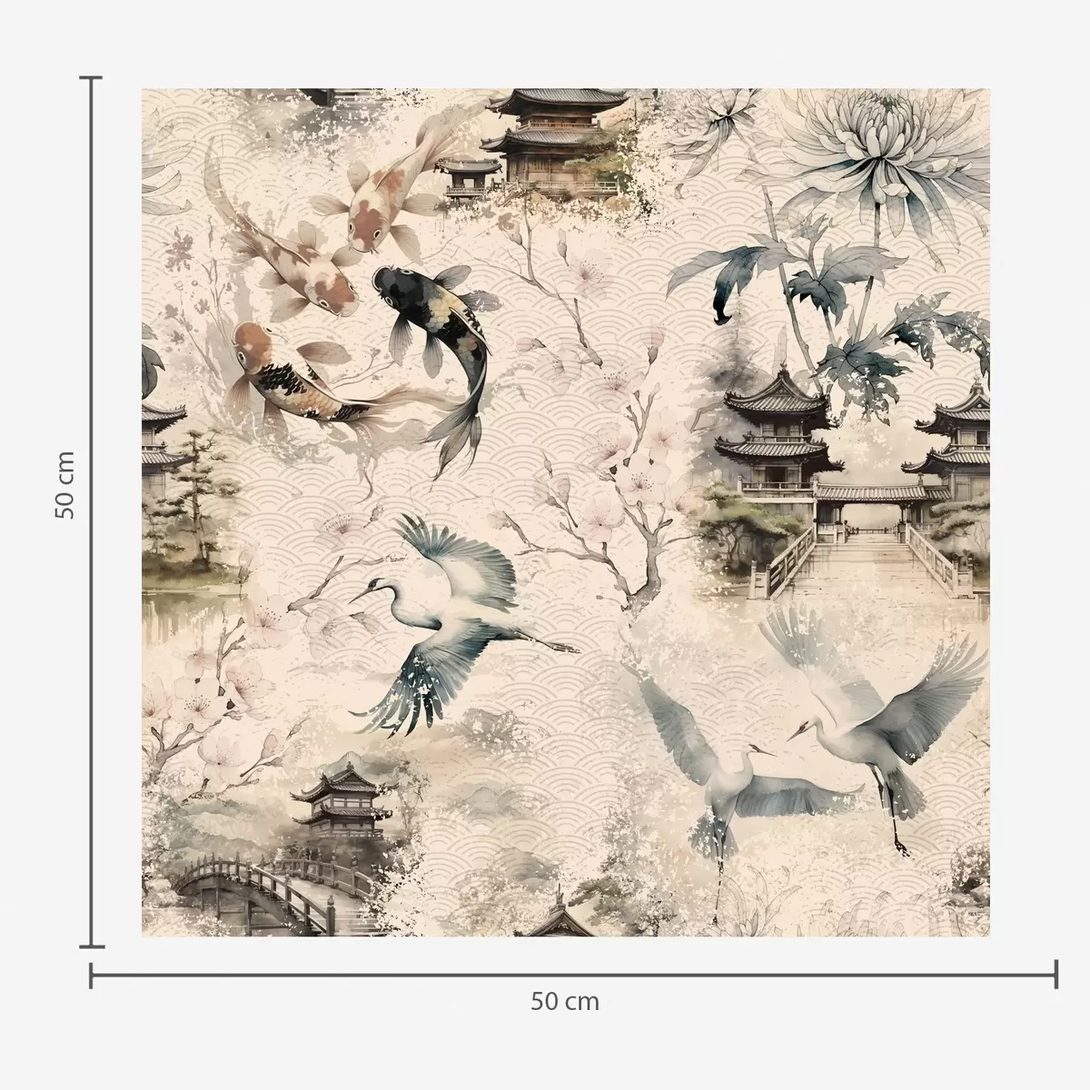 Papel pintado Templos japoneses, peces koi y grullas sobre un fondo suave. Nr. a01040
