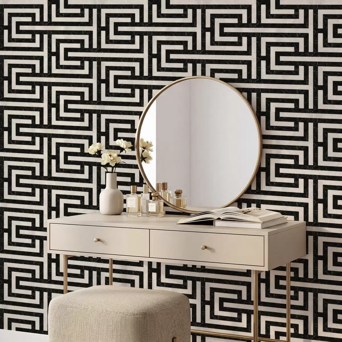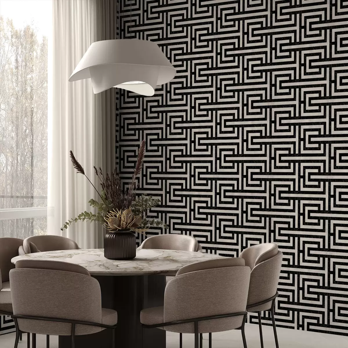 Papel pintado Patrón geométrico en blanco y negro con forma de laberinto Nr. a01073