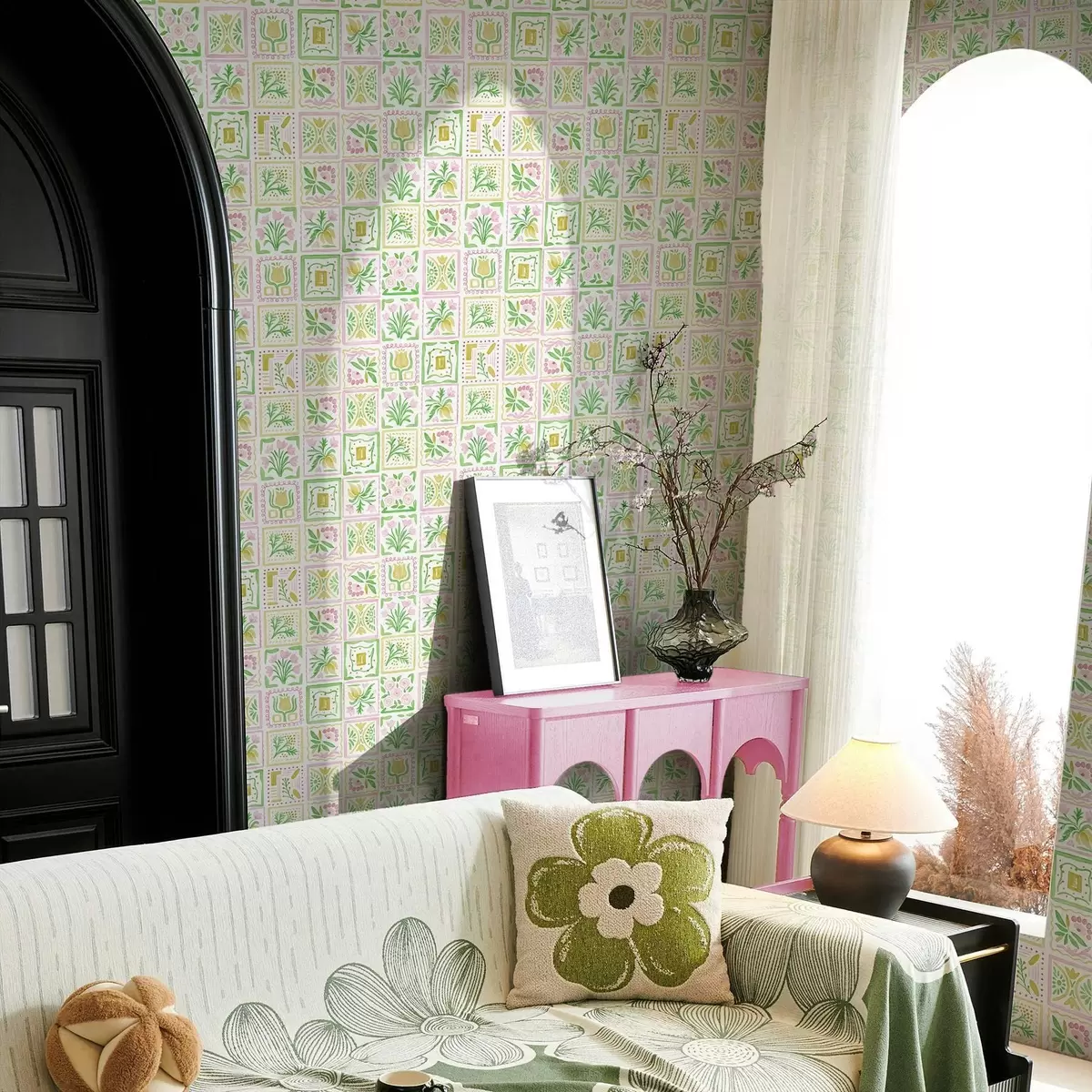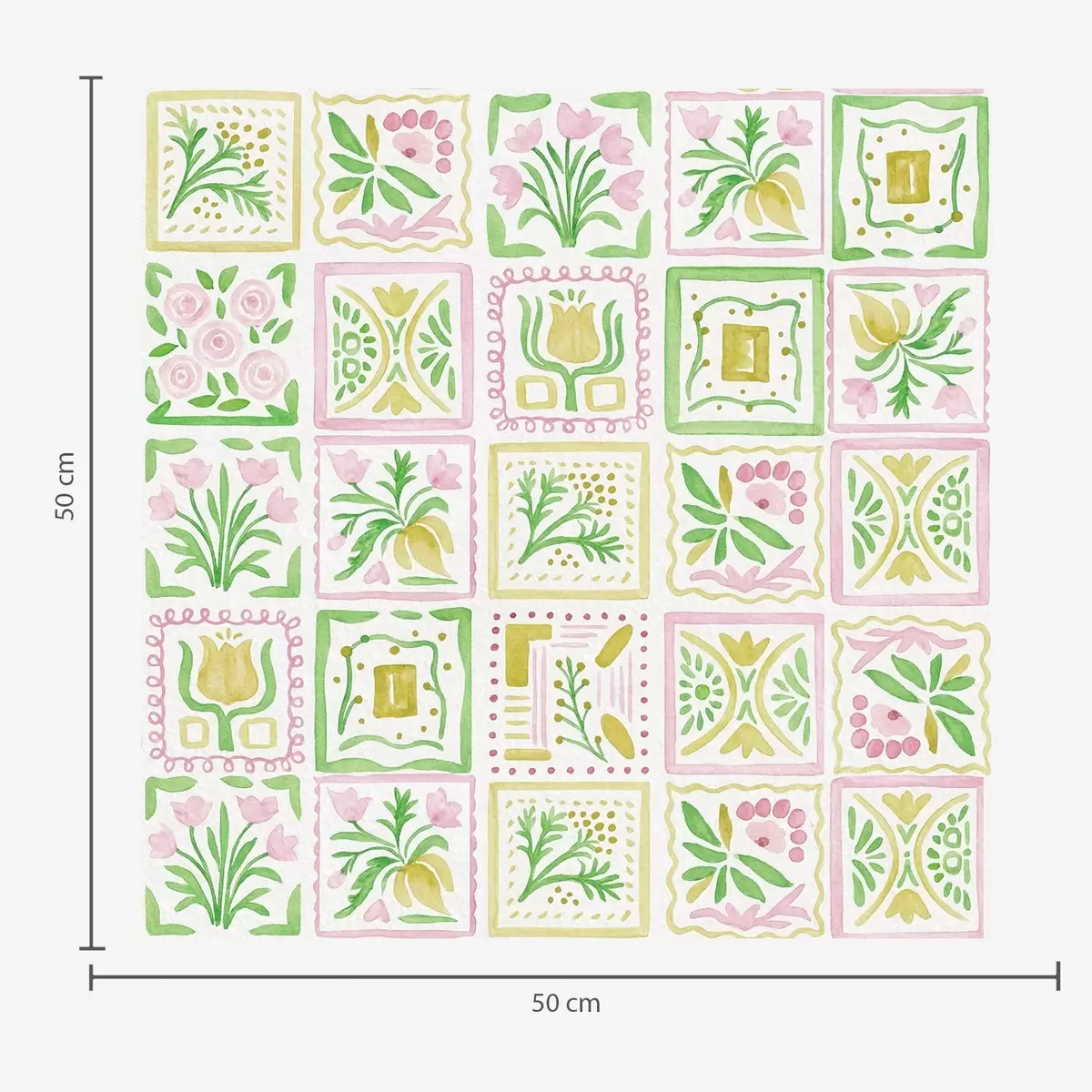 Papel pintado Cuadrados acuarelados con ramas rosas y verdes Nr. a01082