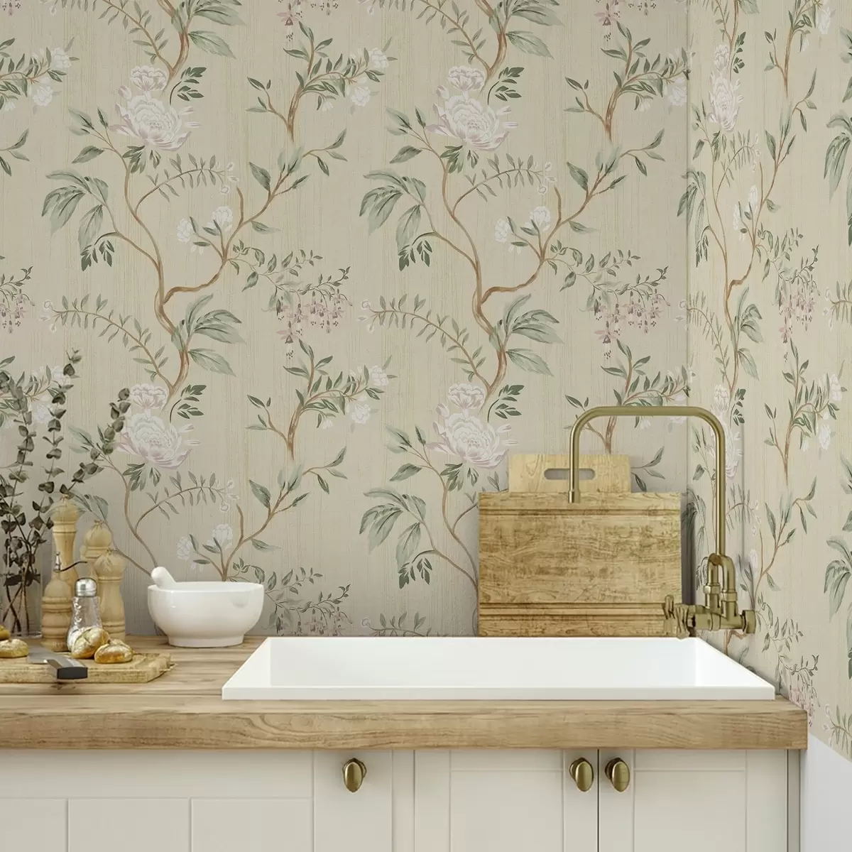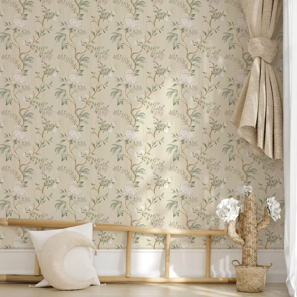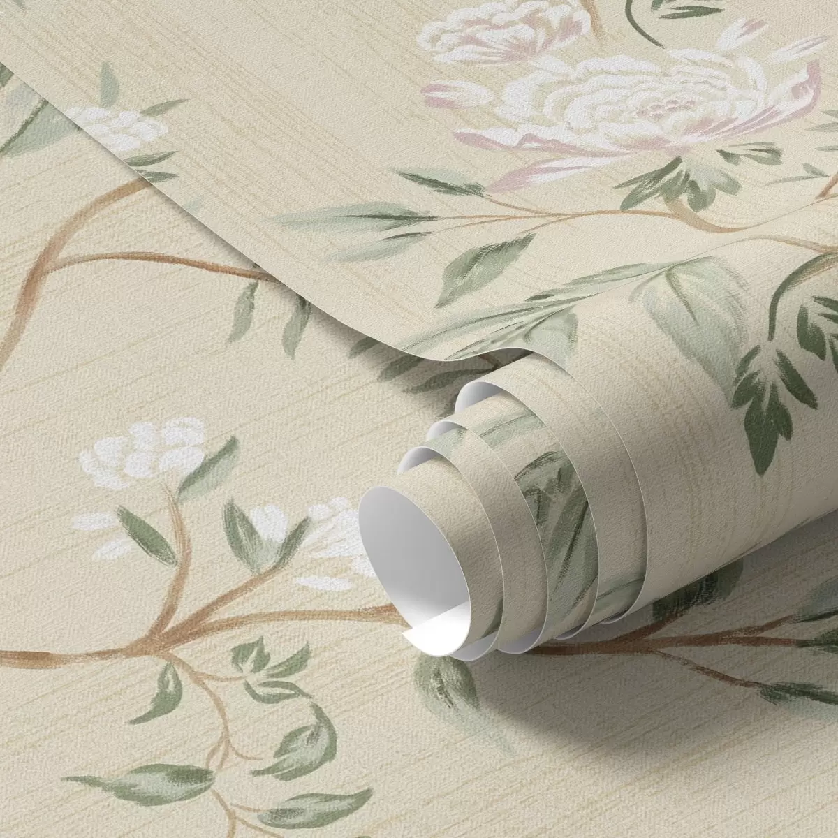 Papel pintado Delicadas ramas con flores sobre un cálido fondo color crema. Nr. a01084